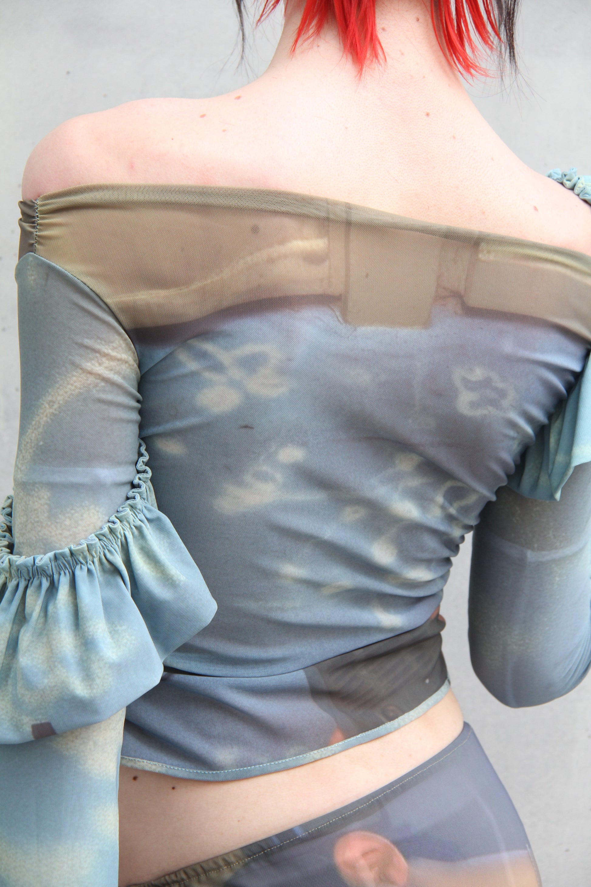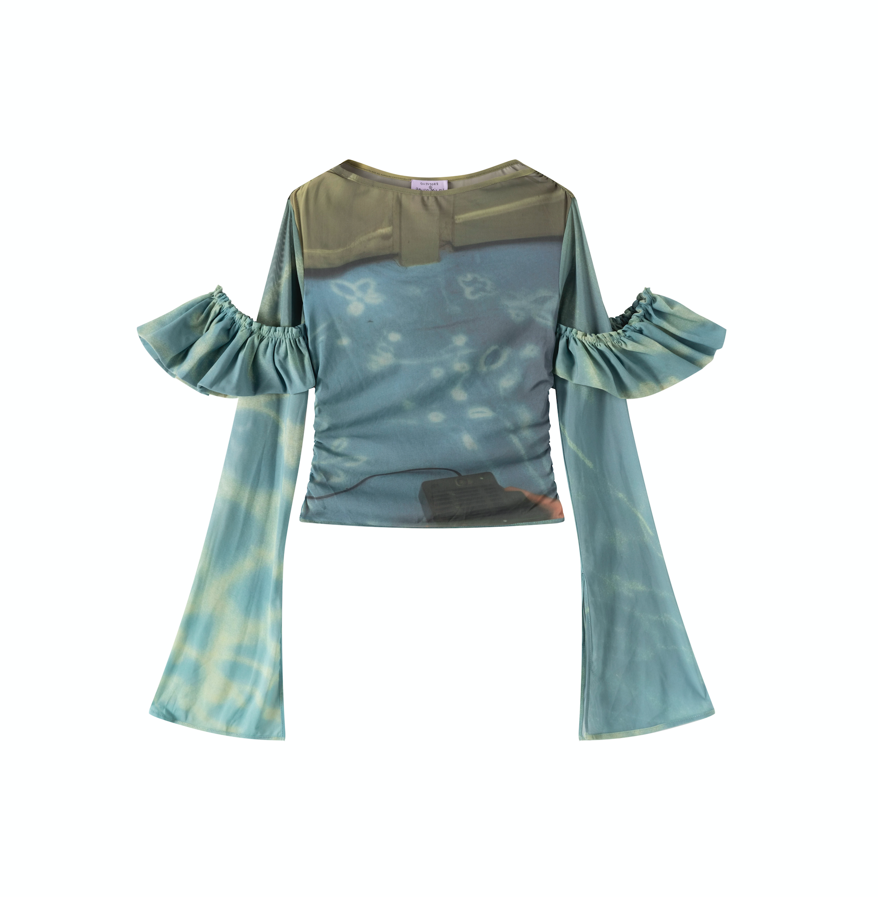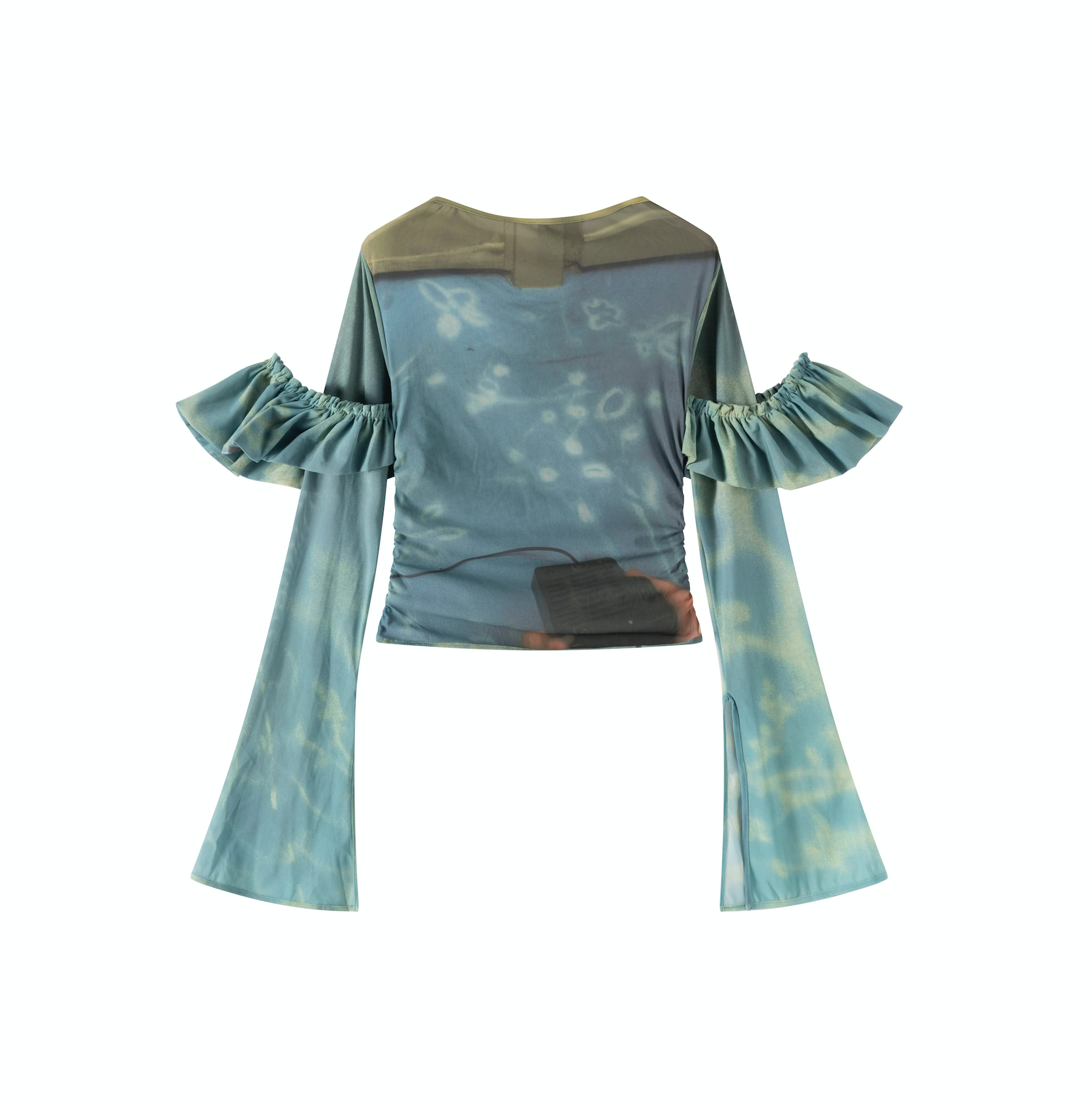 - The side ruffle sleeves can be worn draped over the shoulders or naturally off-shoulder