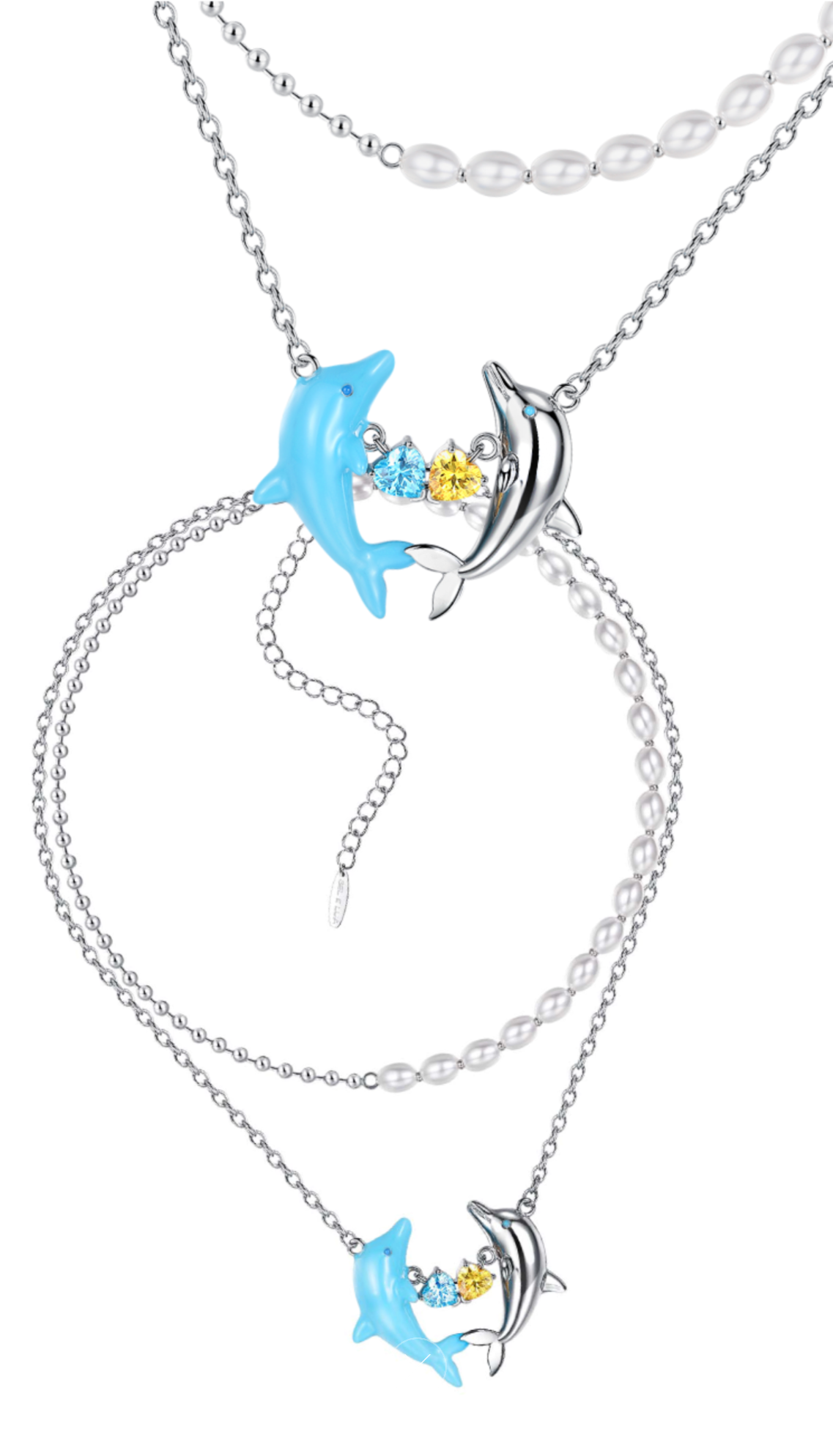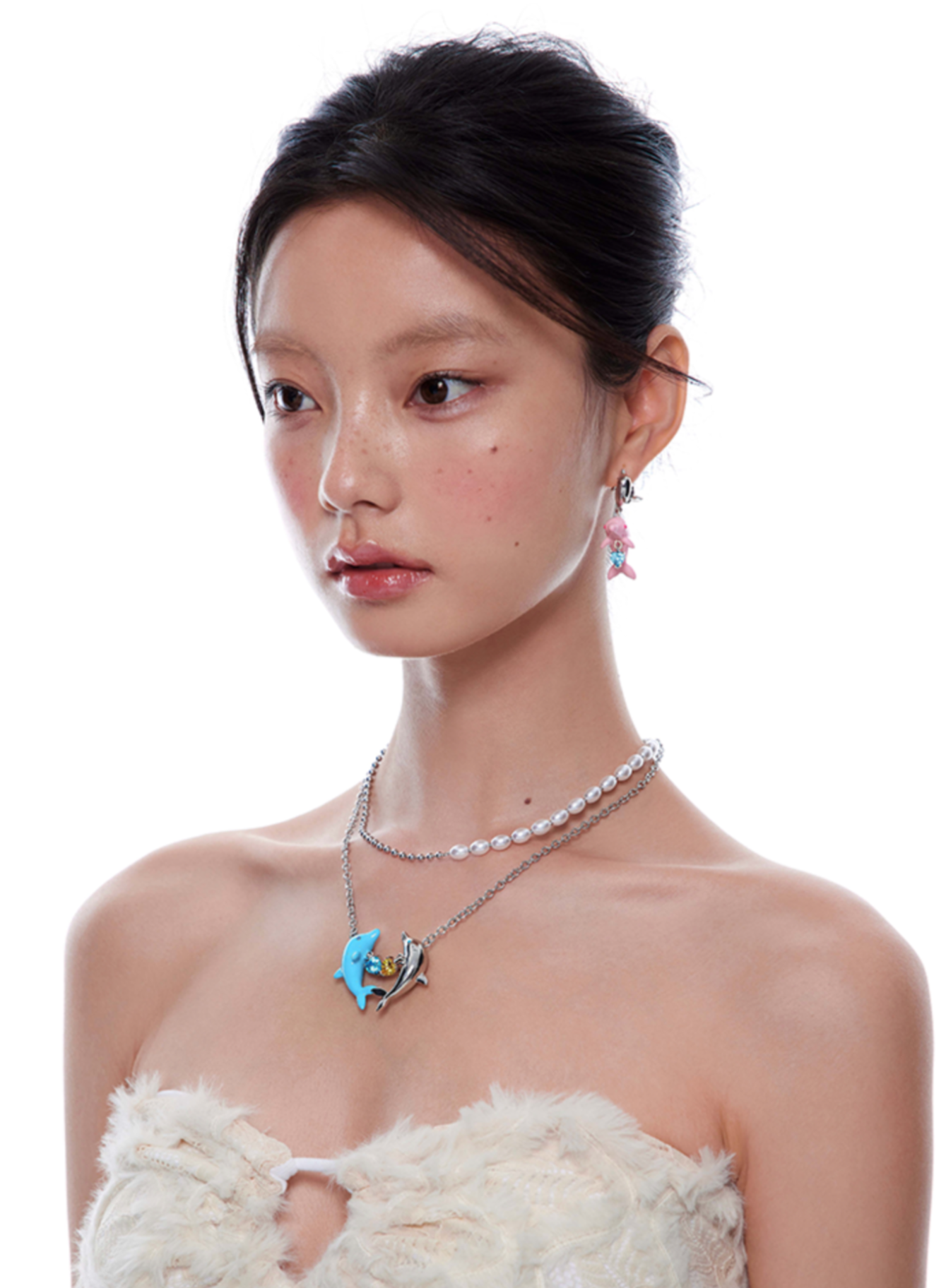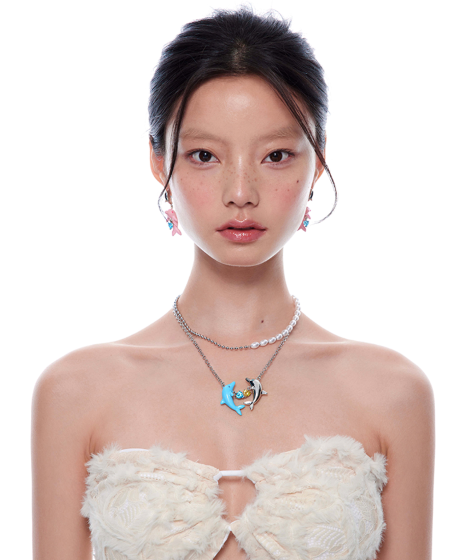 Inspired by the whimsical fantasies of Generation Z teens who grew up in the millennium, the Dolphin Heart Hug Double Layer Necklace evokes a playful, daydreaming, nostalgic, and innocent ambiance. This series reimagines the imagery of old toys, immersing the wearer in a fictional space that forms the core narrative of the collection.