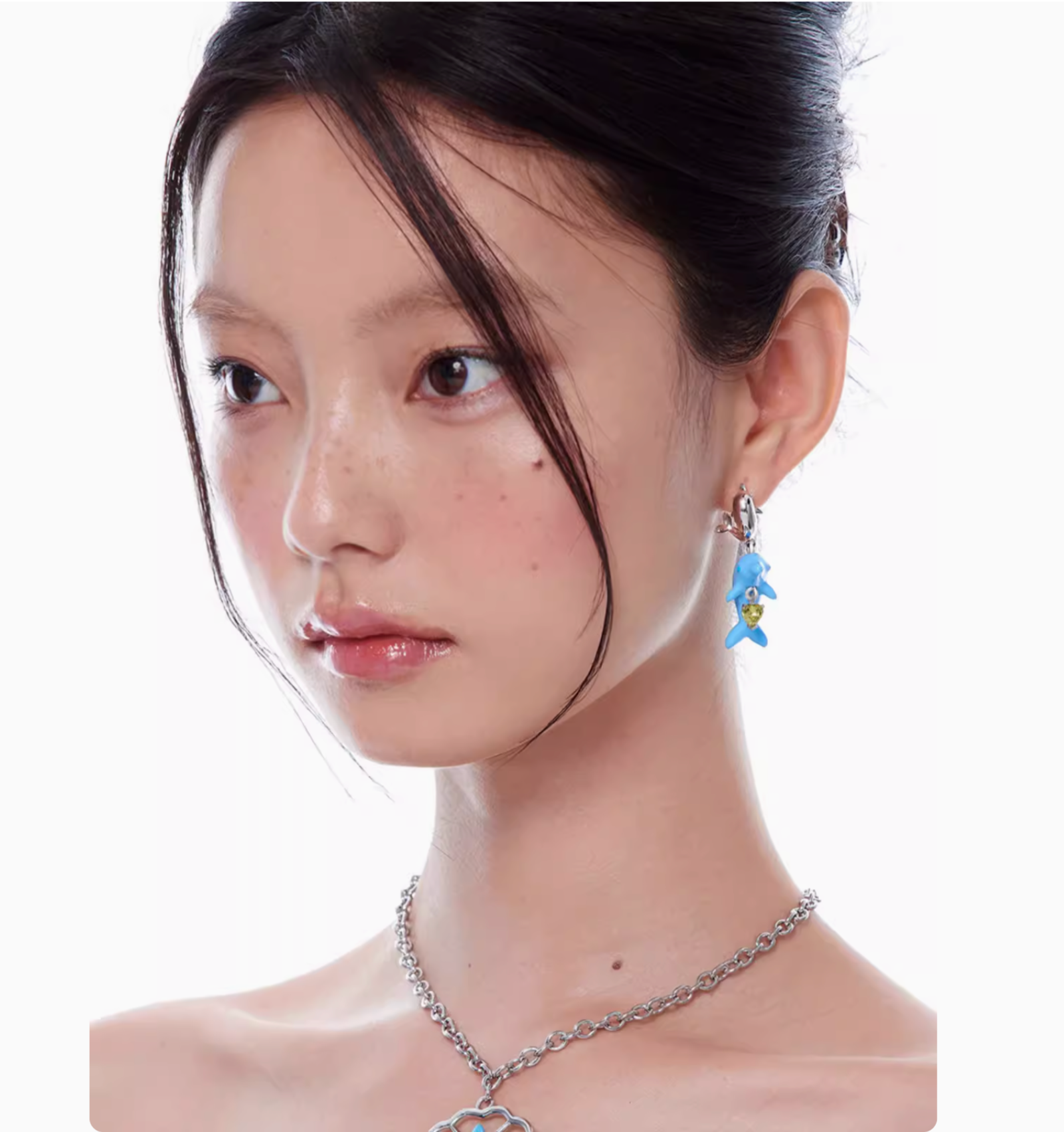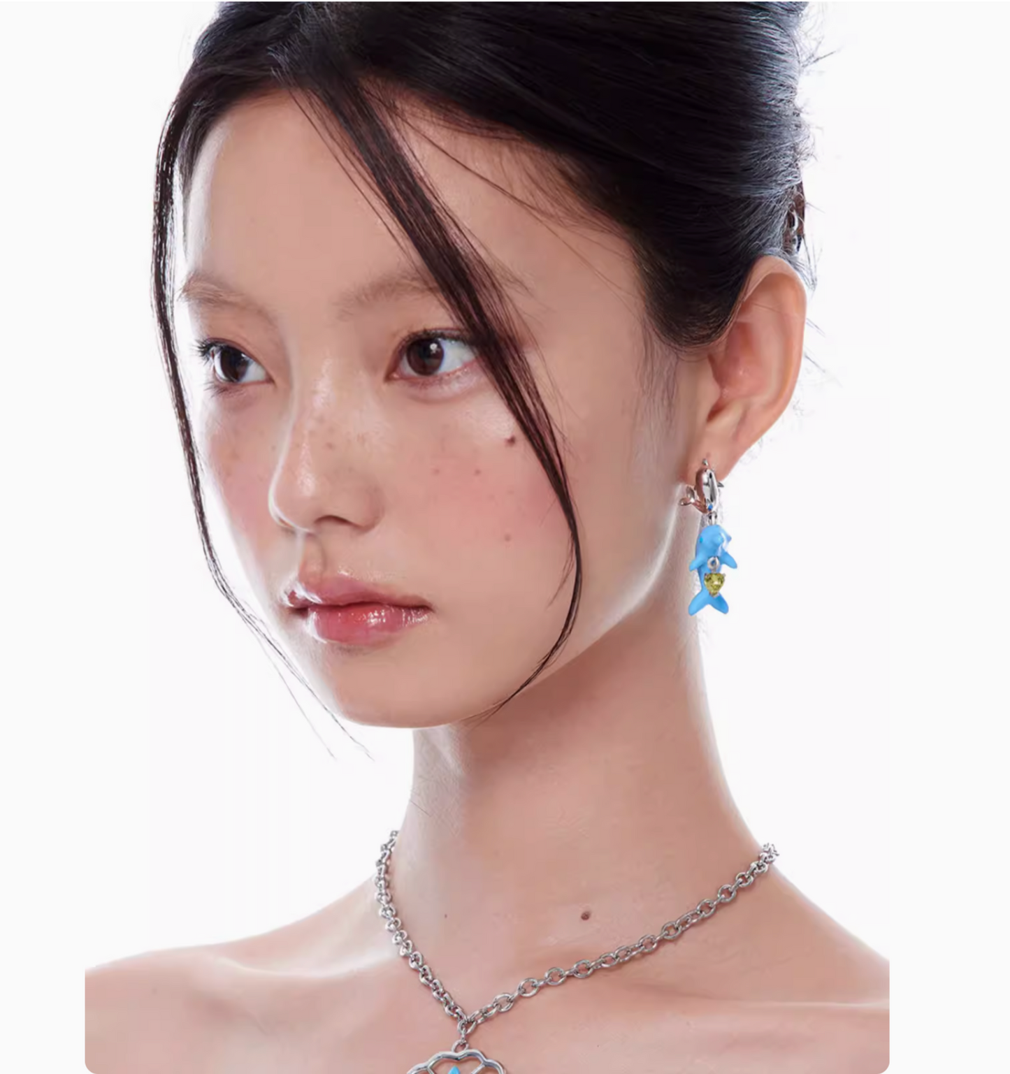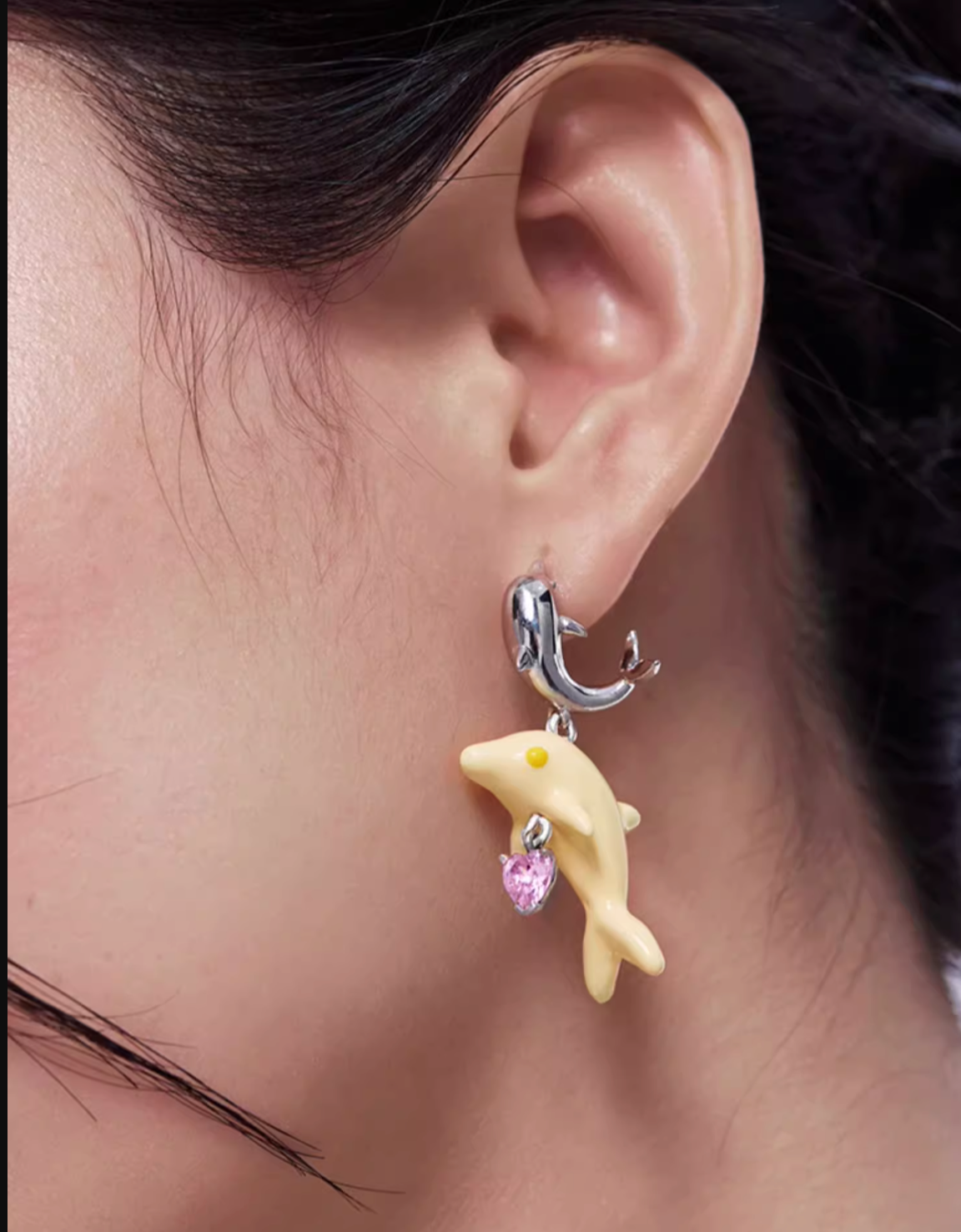 Inspired by the whimsical fantasies of Generation Z teens who grew up in the millennium, the Dolphin Hugs Heart Earrings evokes a playful, daydreaming, nostalgic, and innocent ambiance. This series reimagines the imagery of old toys, immersing the wearer in a fictional space that forms the core narrative of the collection.