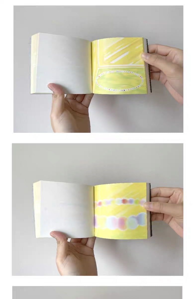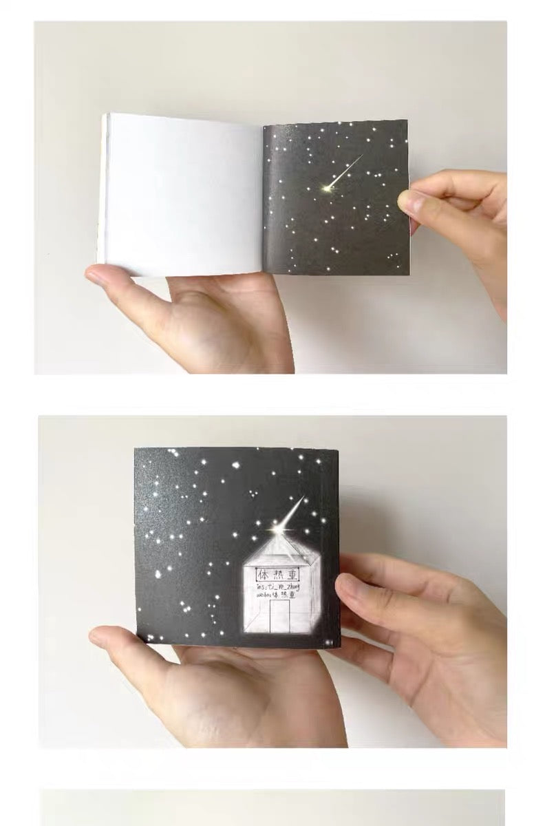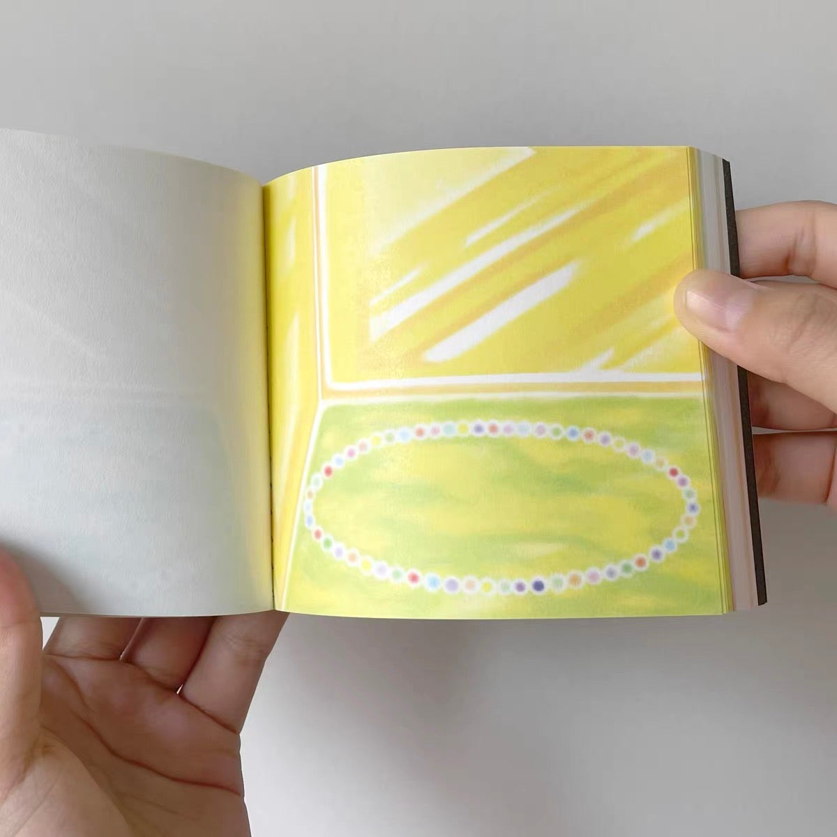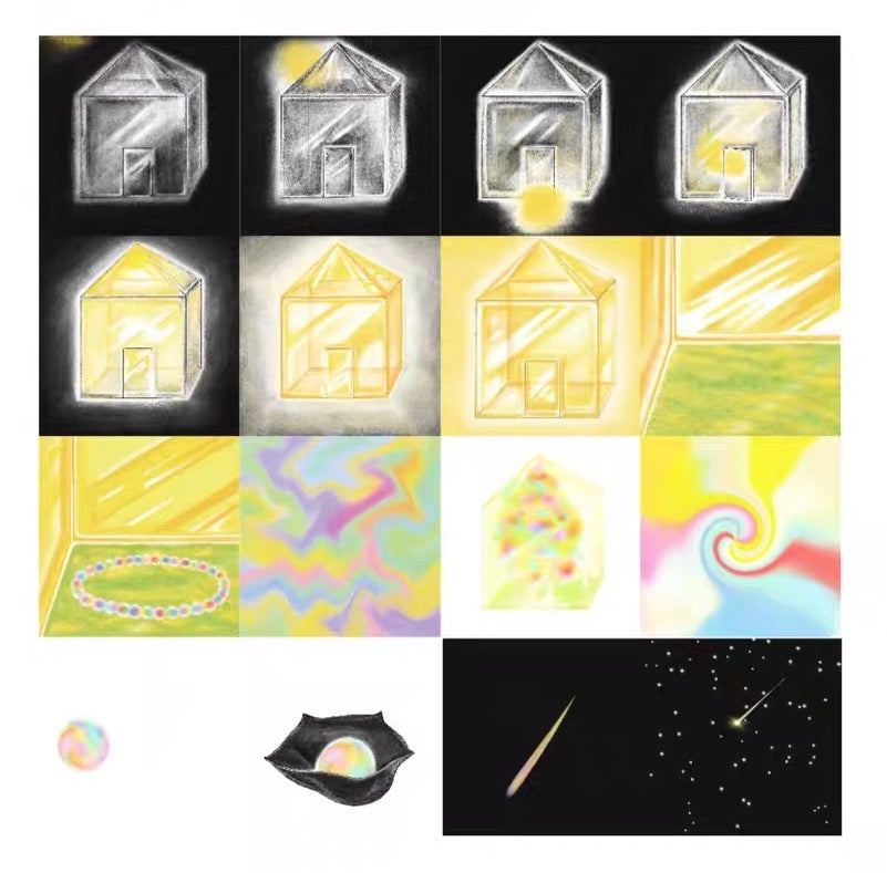 The room becomes colorful and starts to sway, eventually transforming into a sphere wrapped in a black cloth, becoming a shooting star in space..."
