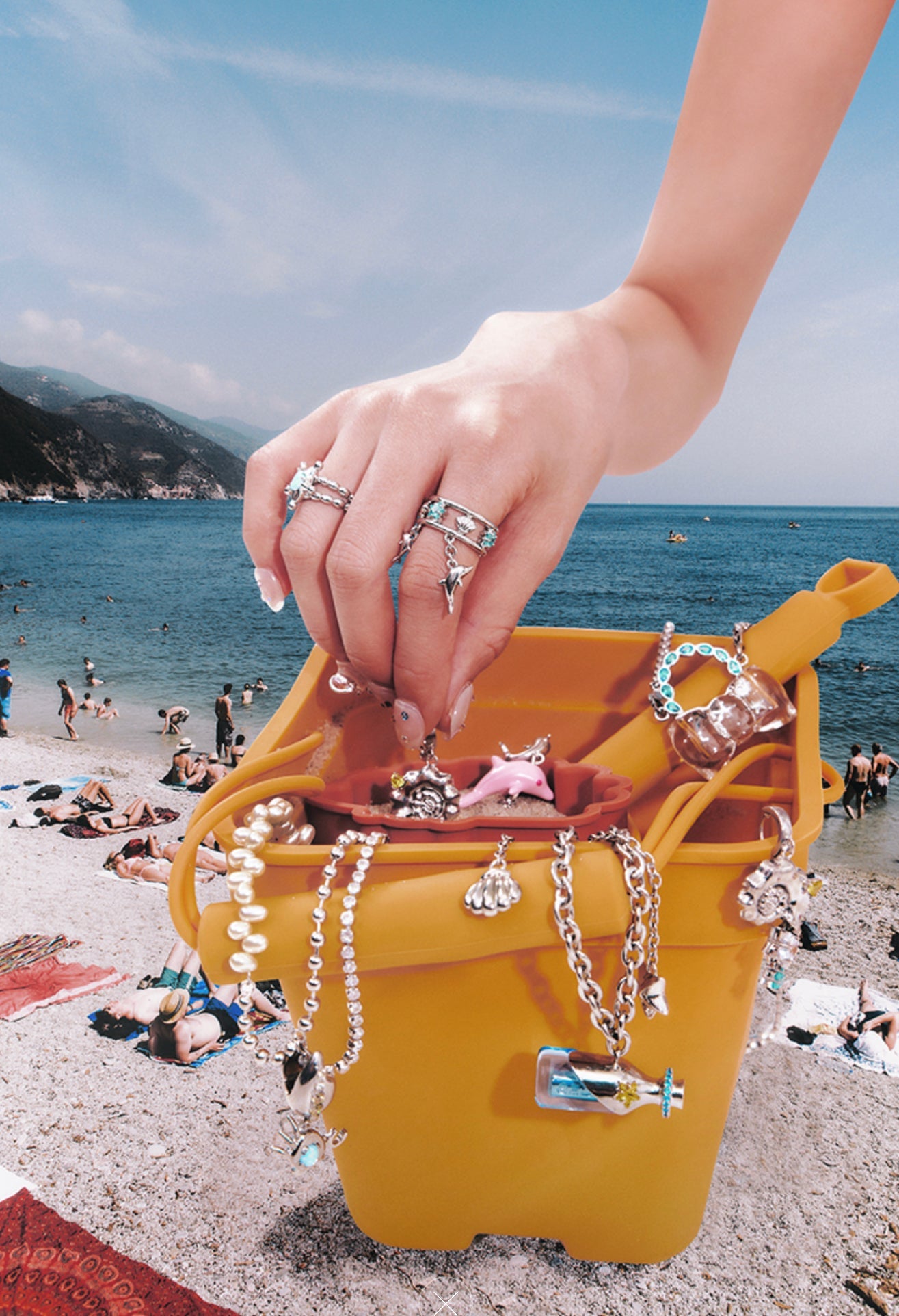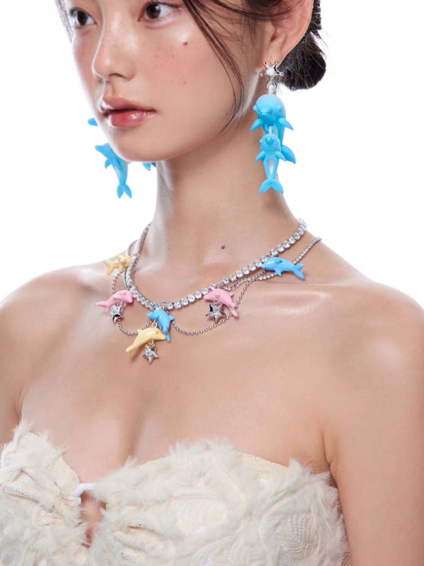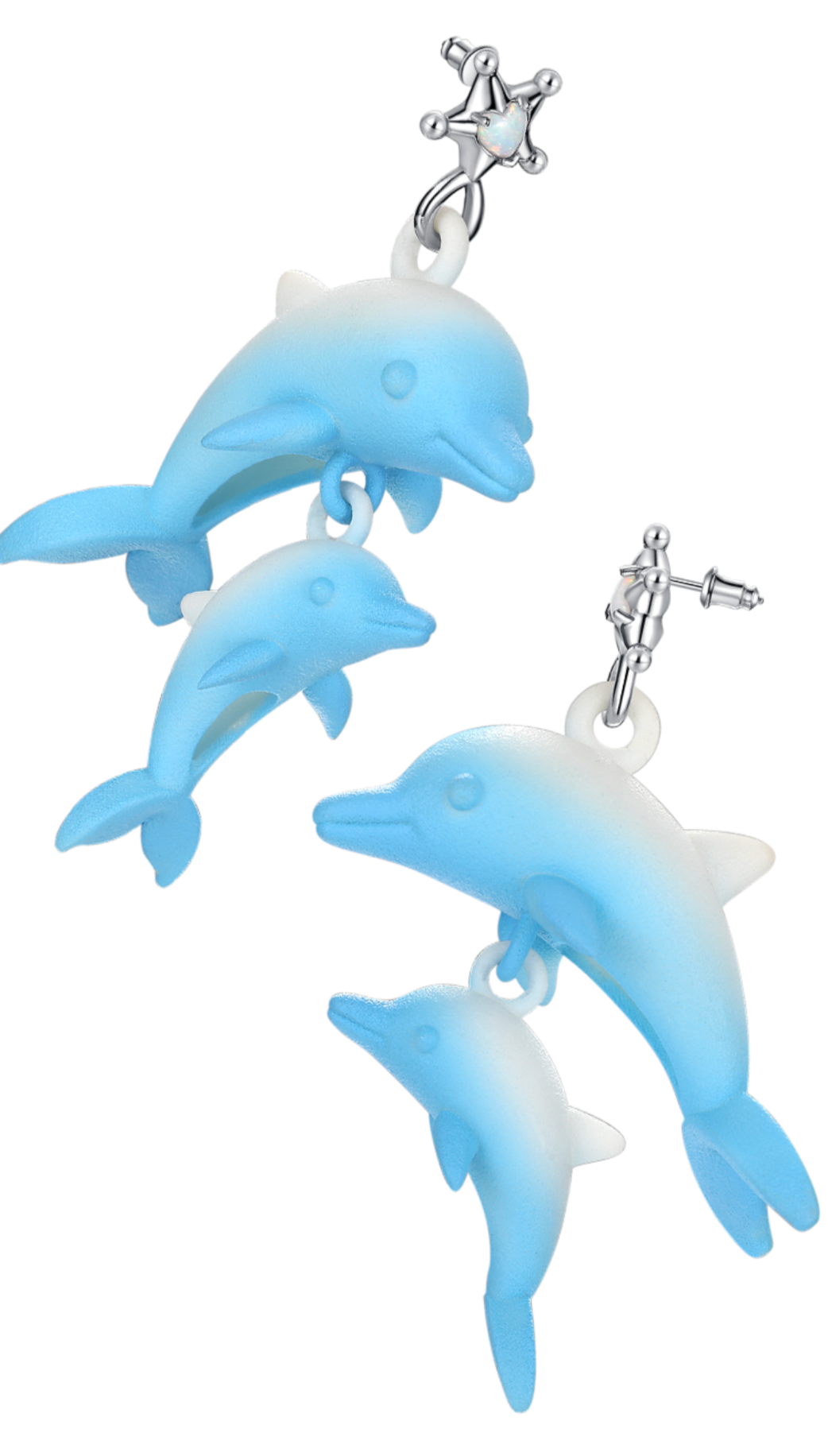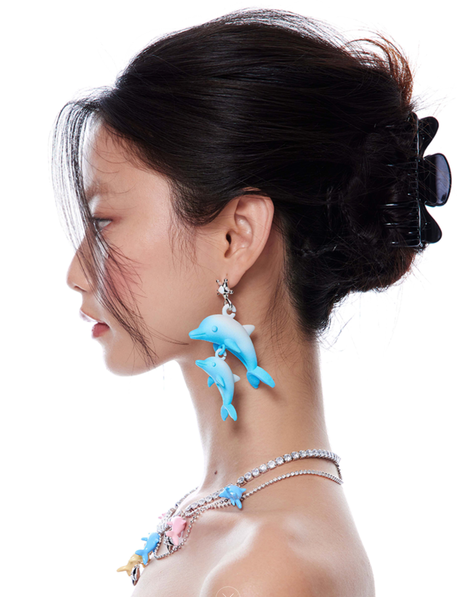 Inspired by the whimsical fantasies of Generation Z teens who grew up in the millennium, the Jumping Dolphin Earrings evokes a playful, daydreaming, nostalgic, and innocent ambiance. This series reimagines the imagery of old toys, immersing the wearer in a fictional space that forms the core narrative of the collection.