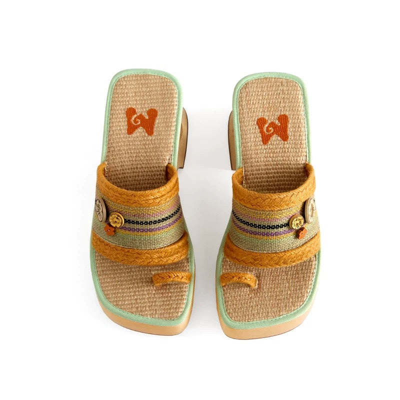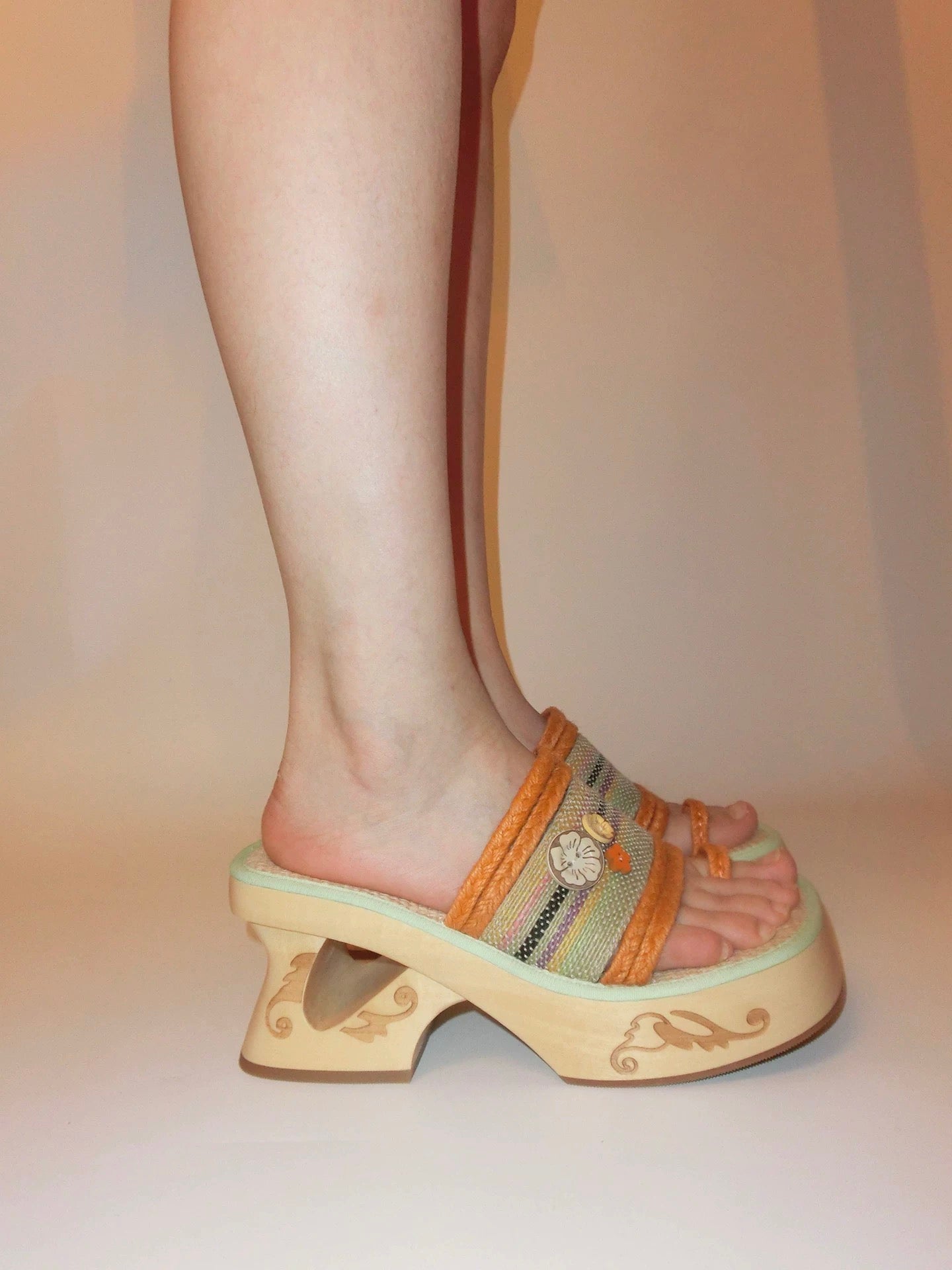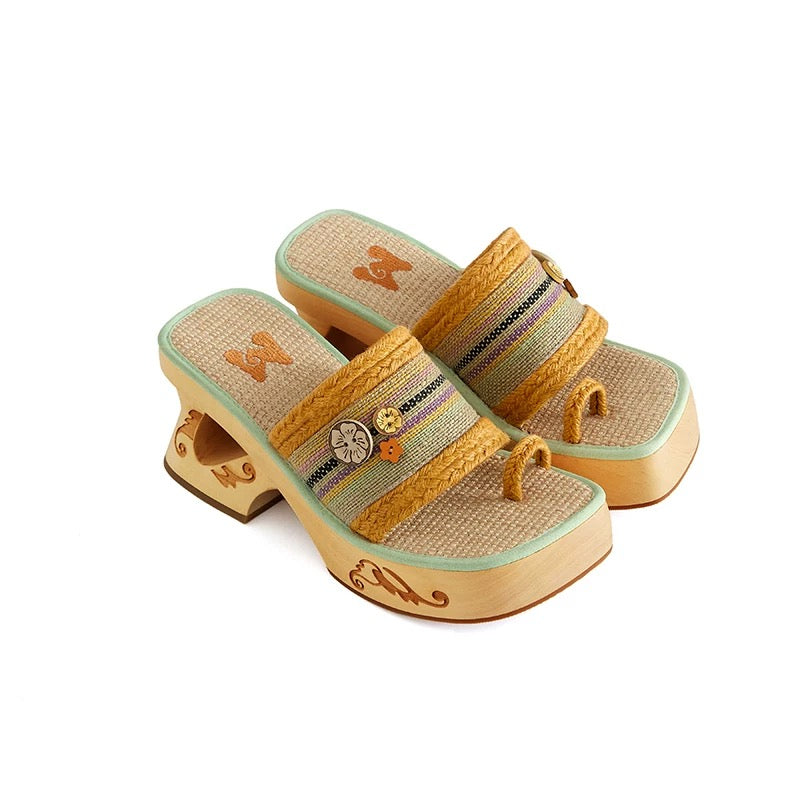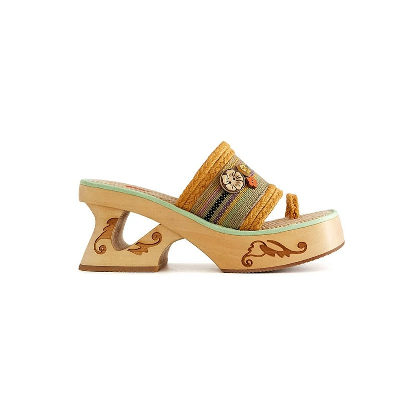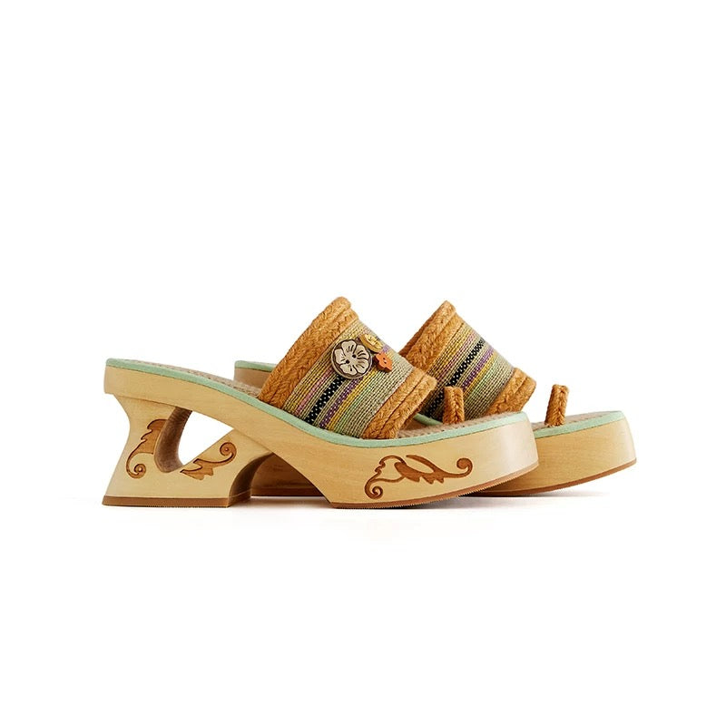 Crafted from natural plant fibers and accented with a carved hibiscus wood button, this wedge sandal brings a lighthearted, vacation-ready energy. The orange and mint green contrast trim breathes freshness into every step, while the 8cm wooden heel provides lift with stability and character.