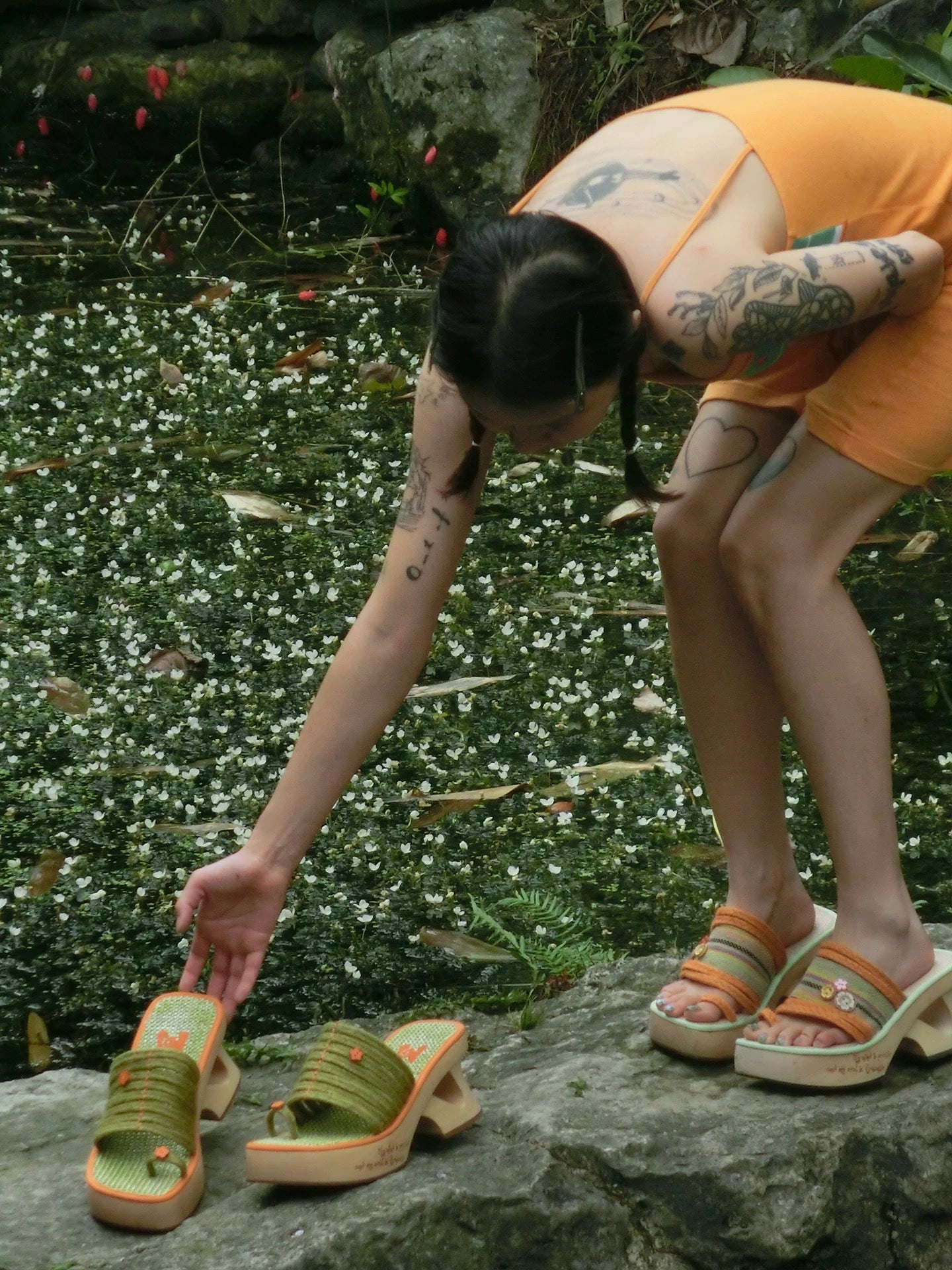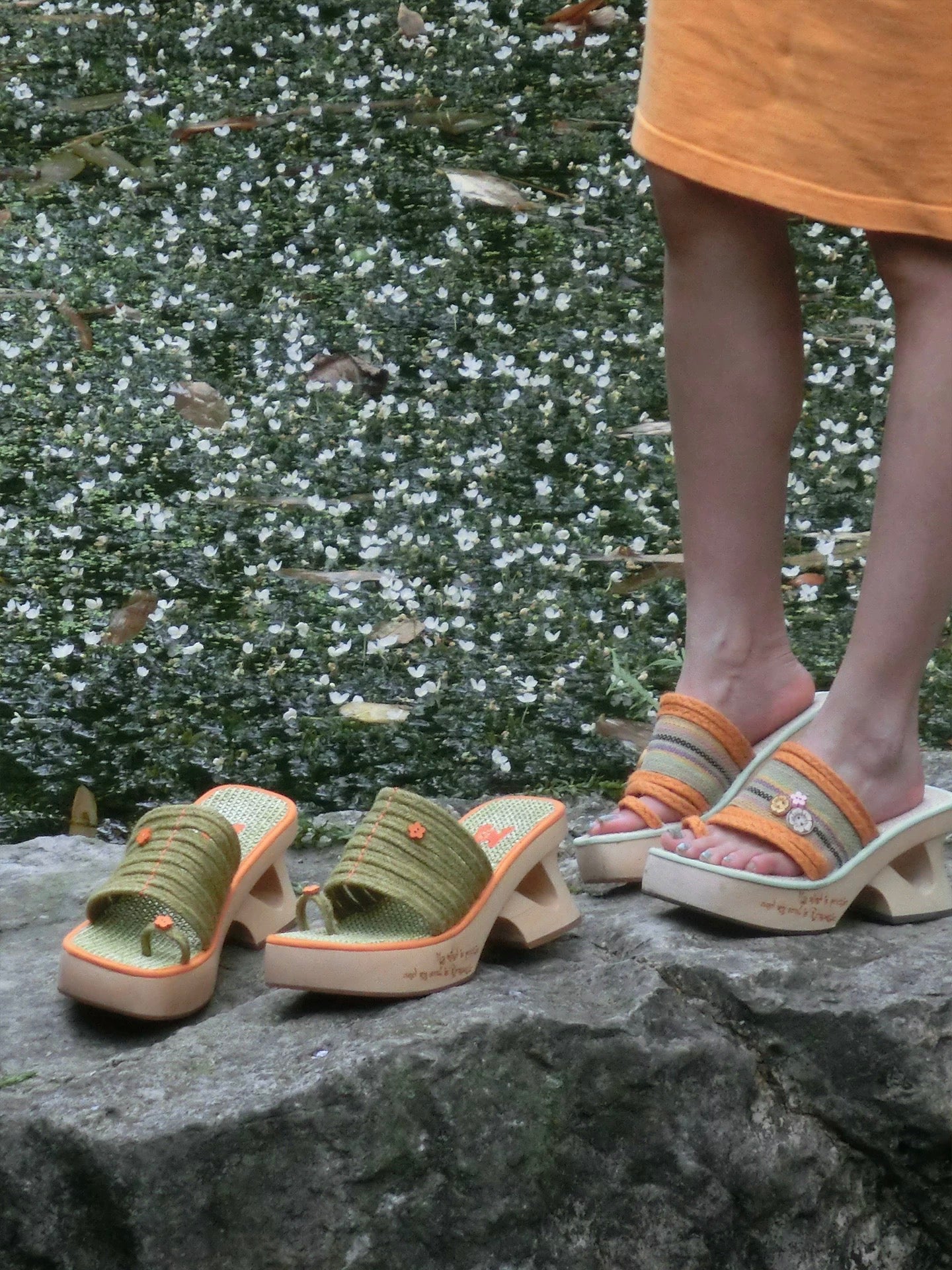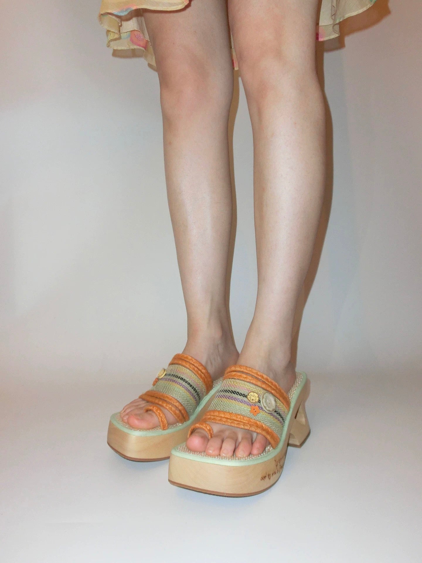 Crafted from natural plant fibers and accented with a carved hibiscus wood button, this wedge sandal brings a lighthearted, vacation-ready energy. The orange and mint green contrast trim breathes freshness into every step, while the 8cm wooden heel provides lift with stability and character.