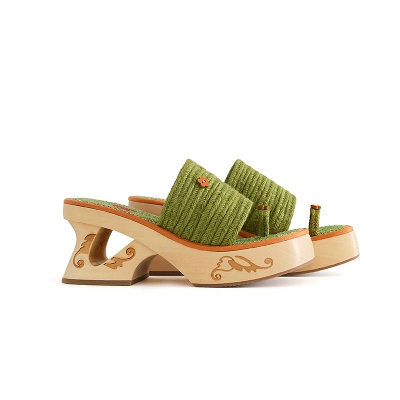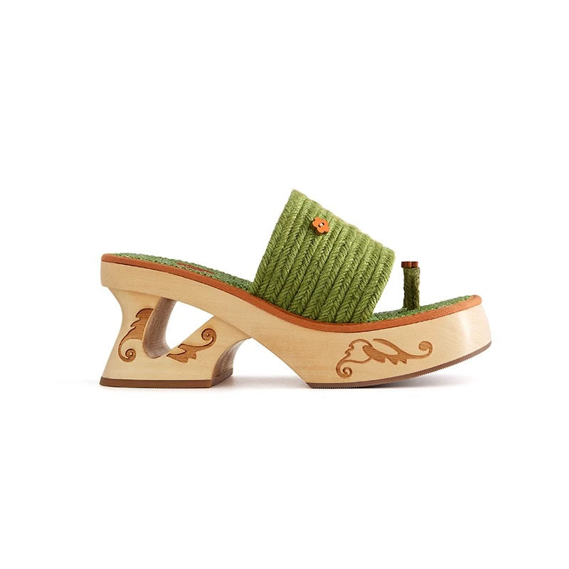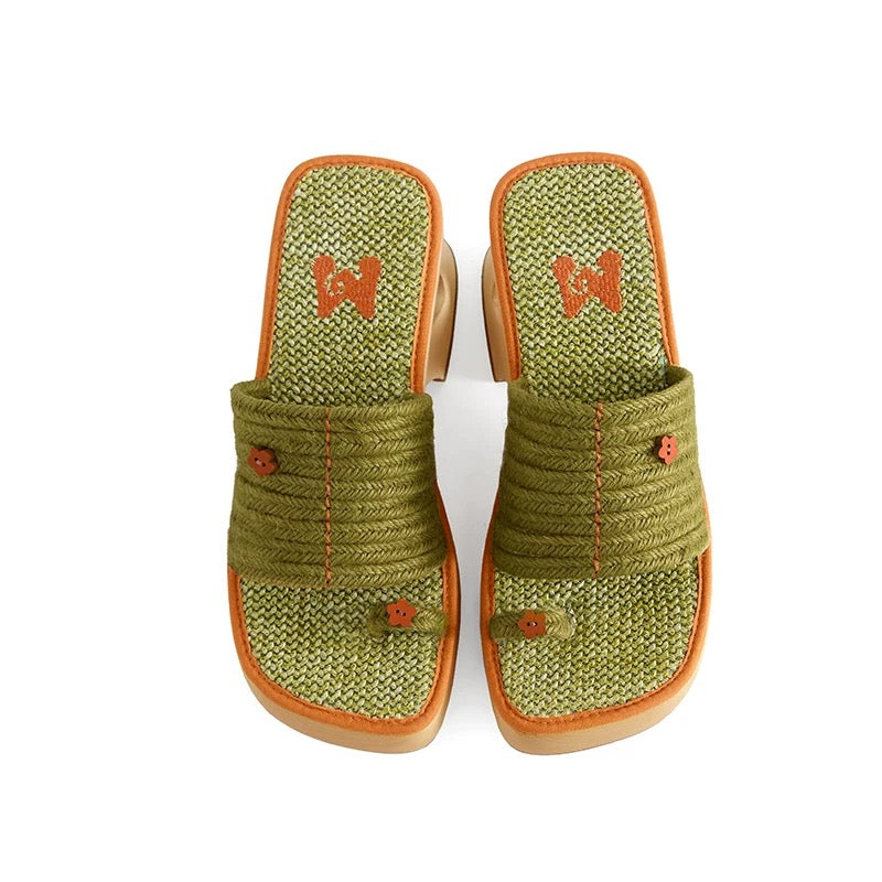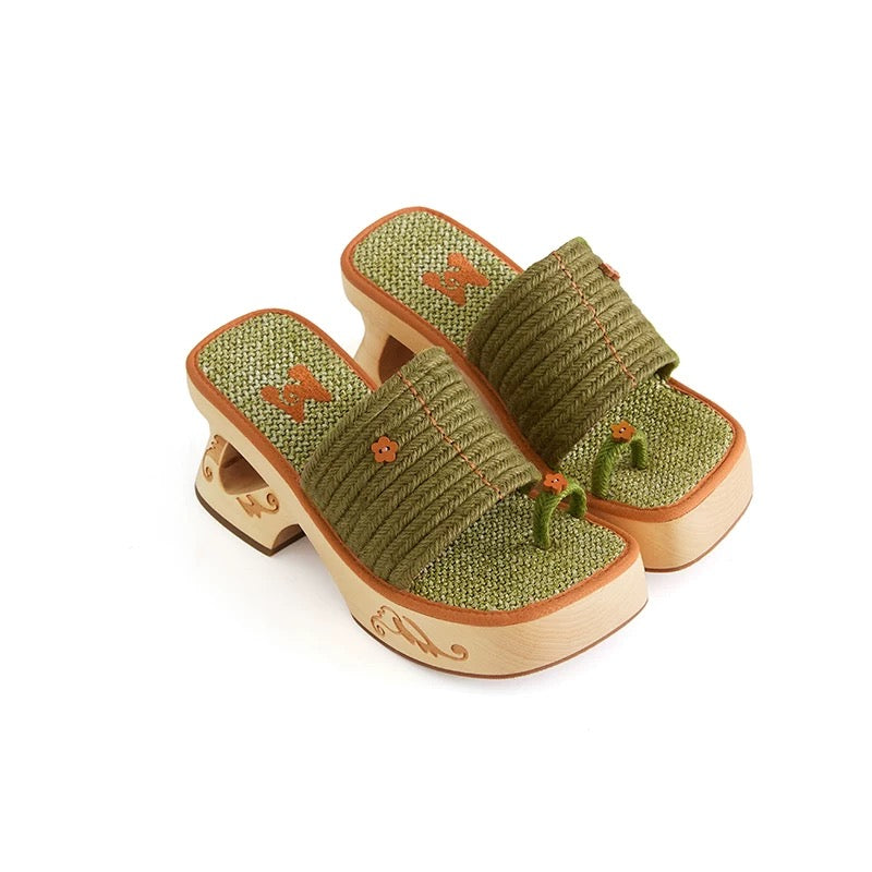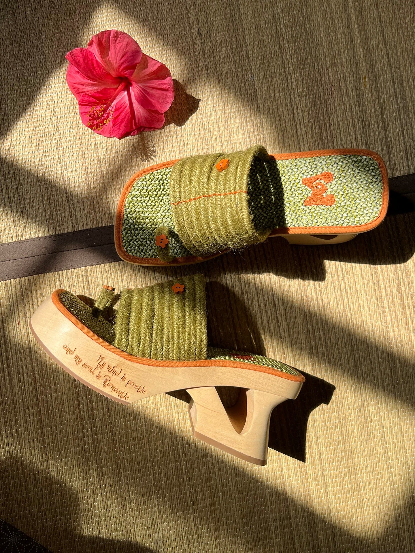 Crafted from natural plant fibers and accented with a carved hibiscus wood button, this wedge sandal brings a lighthearted, vacation-ready energy. The orange and mint green contrast trim breathes freshness into every step, while the 8cm wooden heel provides lift with stability and character.