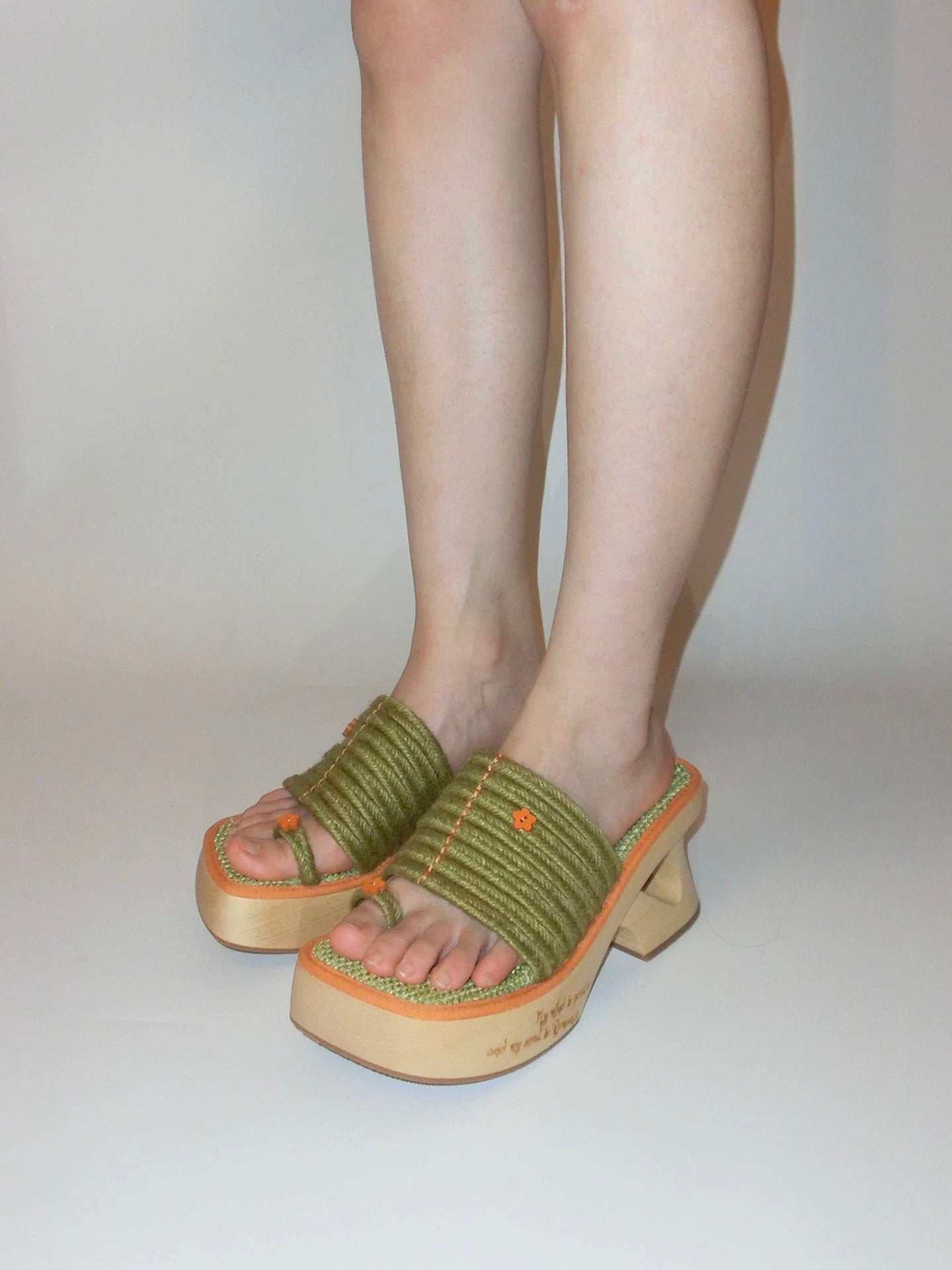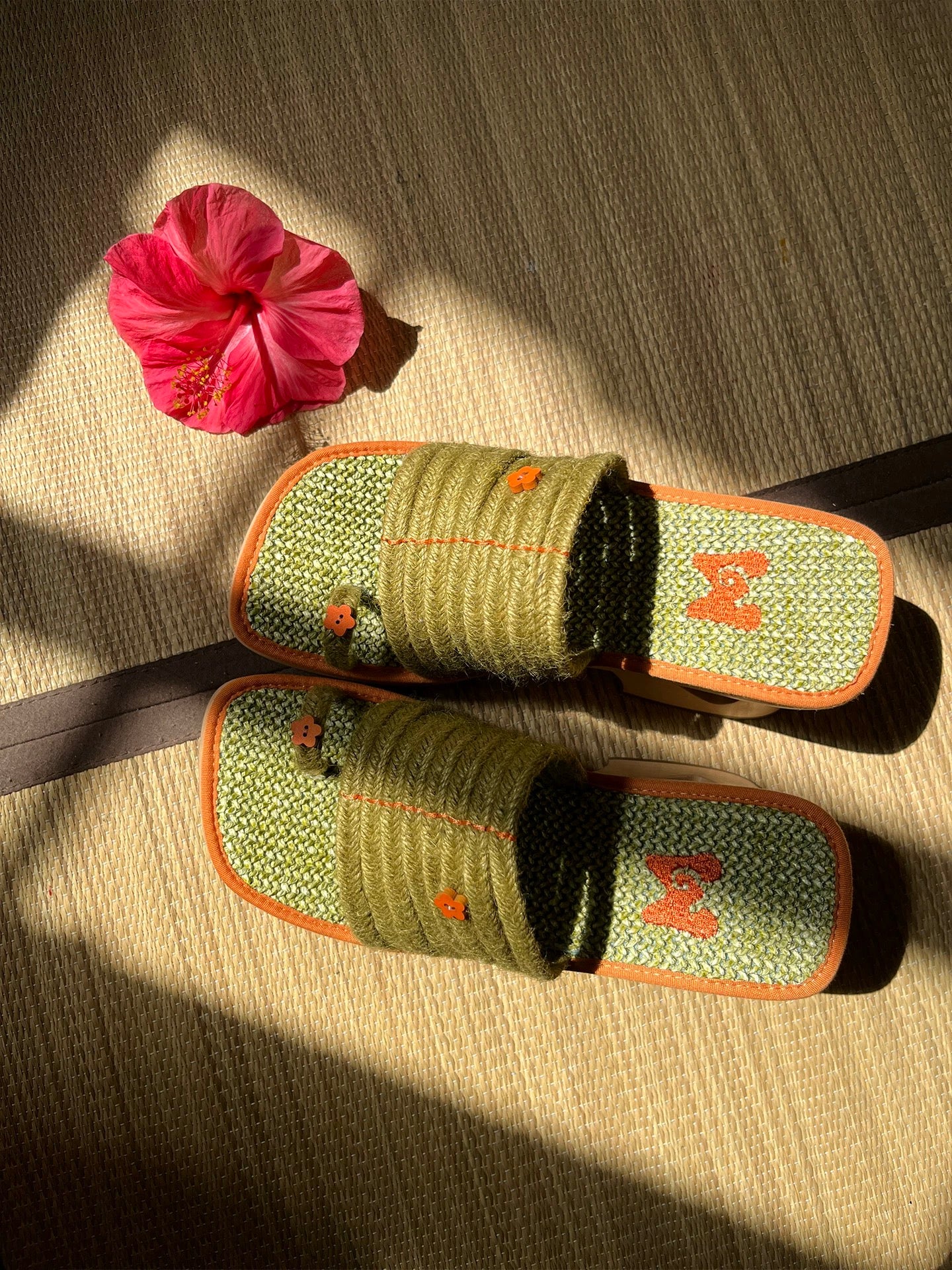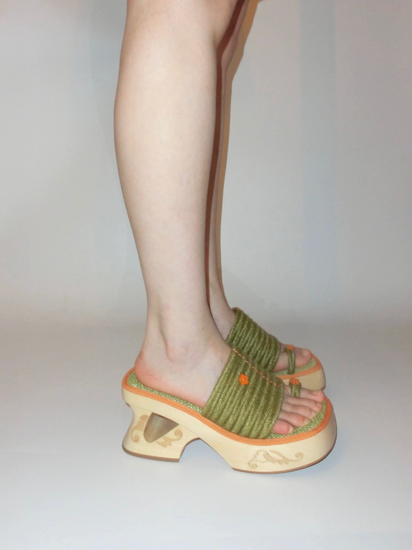 Crafted from natural plant fibers and accented with a carved hibiscus wood button, this wedge sandal brings a lighthearted, vacation-ready energy. The orange and mint green contrast trim breathes freshness into every step, while the 8cm wooden heel provides lift with stability and character.